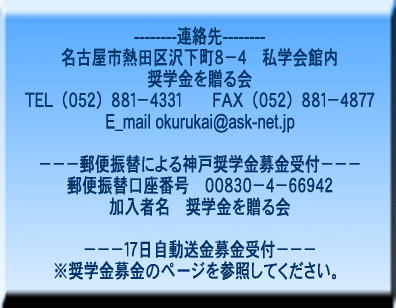 | 贈る会とは? | 奨学金を贈る会の事をまとめたページです。初めてお越しの方は是非ご覧になってください。 |